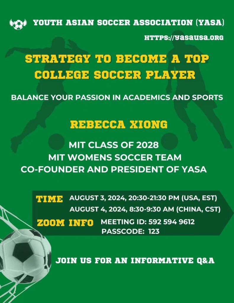 Experience Sharing Zoom Meeting on the College Soccer Recruitment Process (Aug, 2024): YASA members hosted an experience sharing meeting and welcomed kids of all ages from across the region, along with their families. Successful college students shared how soccer has shaped their lives in personal growth, leadership, resilience, and described their exciting journeys through the university recruiting process—balancing both academic and athletic excellence. By highlighting these inspiring stories, the YASA team provided valuable insights, experience, guidance, and encouragement to the community. The event was highly appreciated by both young players and parents, who found it beneficial for navigating their own paths in soccer and beyond.