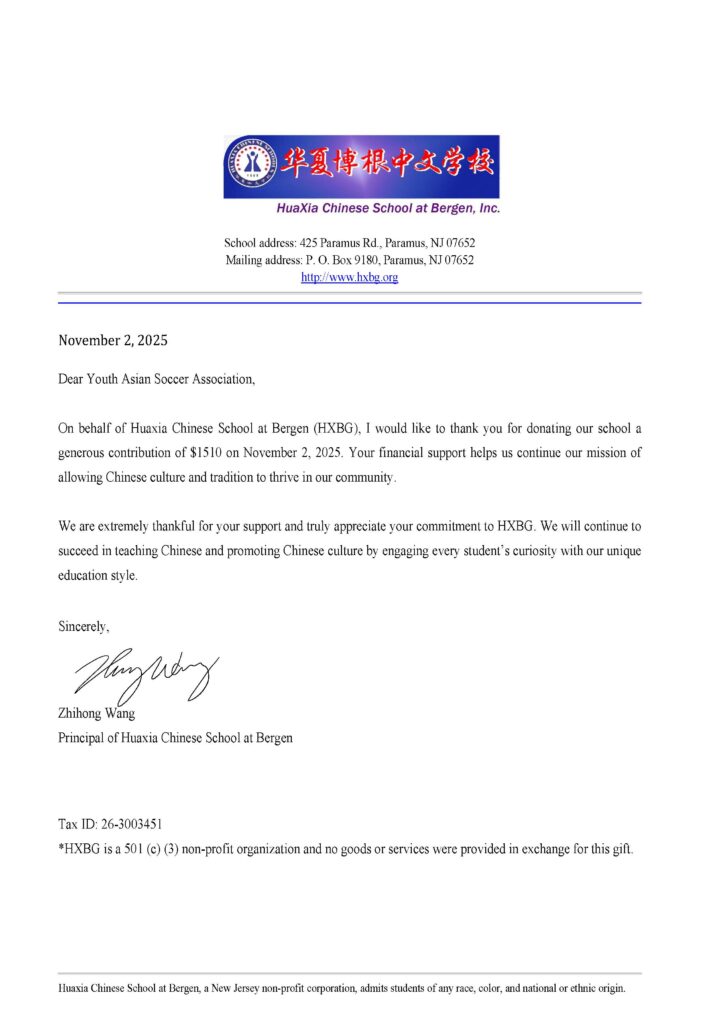 Fundraising to Support NJ Local Chinese School Sports Programs (Sep–Nov 2025): YASA members worked together to organize a successful fundraising campaign supporting Huaxia Chinese School’s soccer and sports programs. Thanks to everyone’s effort, YASA was able to make a meaningful donation that will help the school continue offering fun, active classes for local families and strengthen a wonderful community partnership that promotes health, teamwork, and cultural connection.